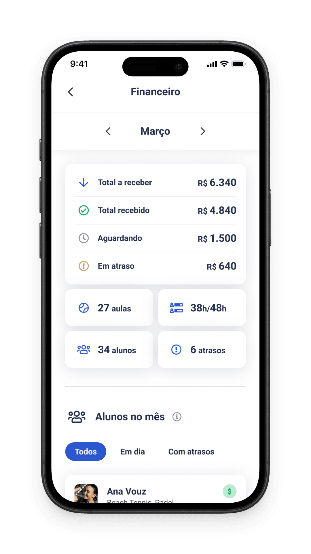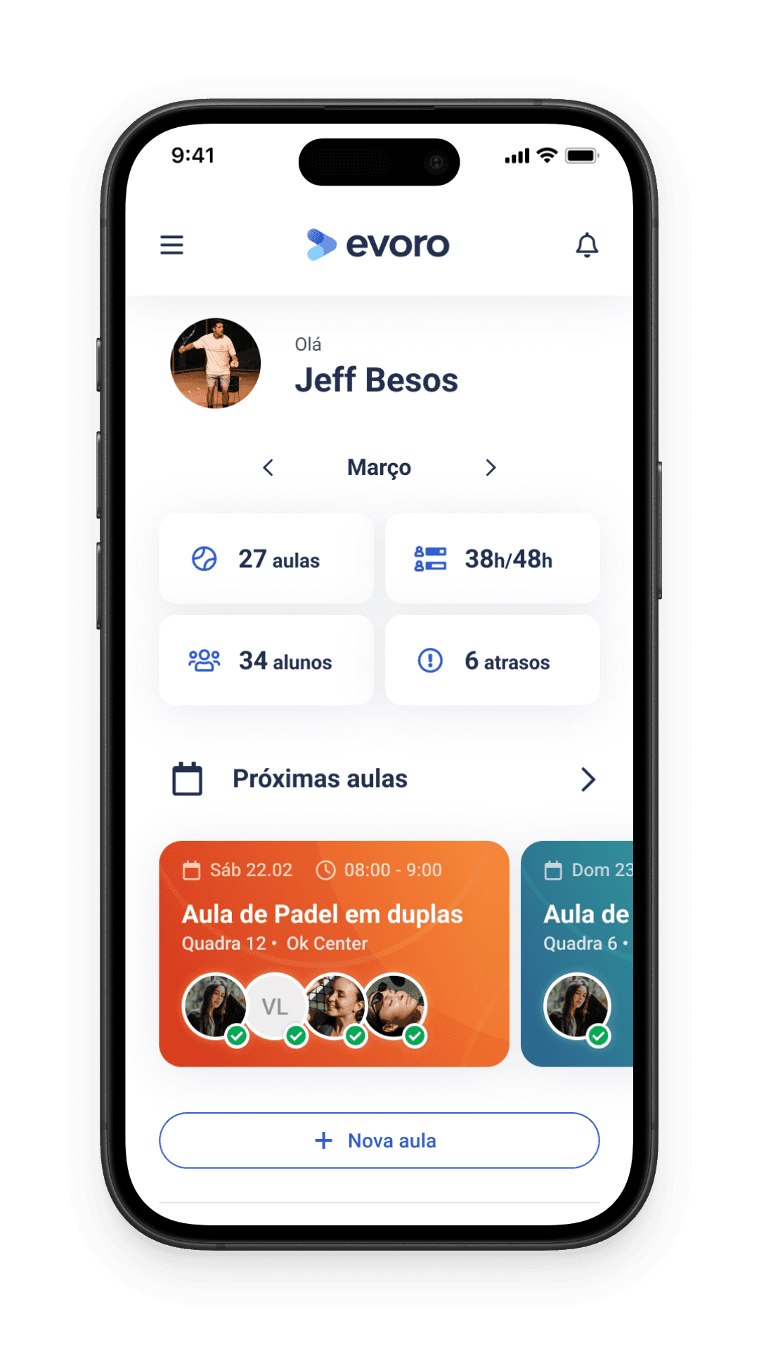 Evoro é o app que organiza sua agenda, seus pagamentos e seus alunos – tudo em um só lugar. Ideal para professores de beach tennis, padel, tênis e muito mais.